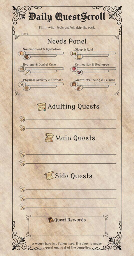 I’ve been working on a way to make daily tasks, chores, routines and self care feel like an adventure by turning them into a videogame-like QuestScroll.